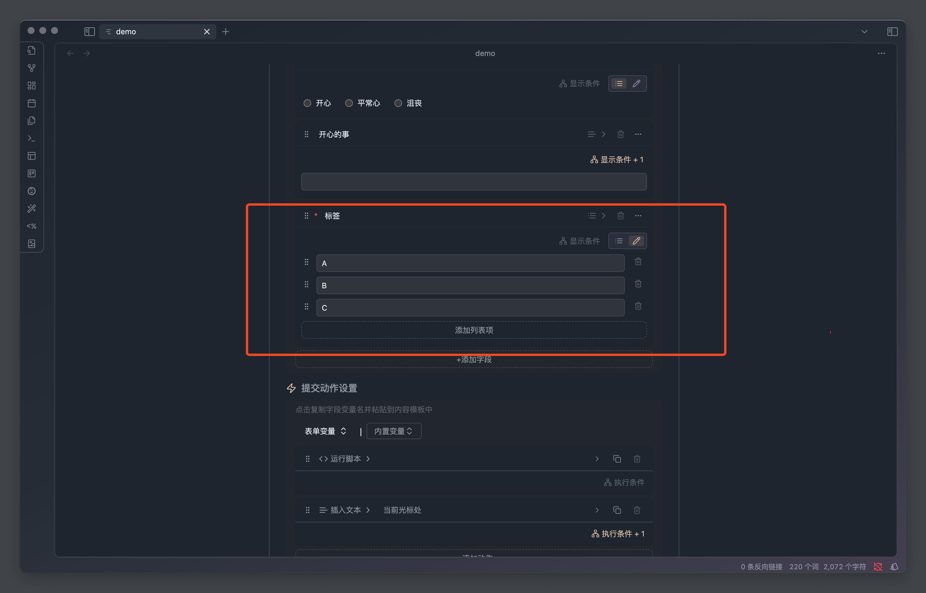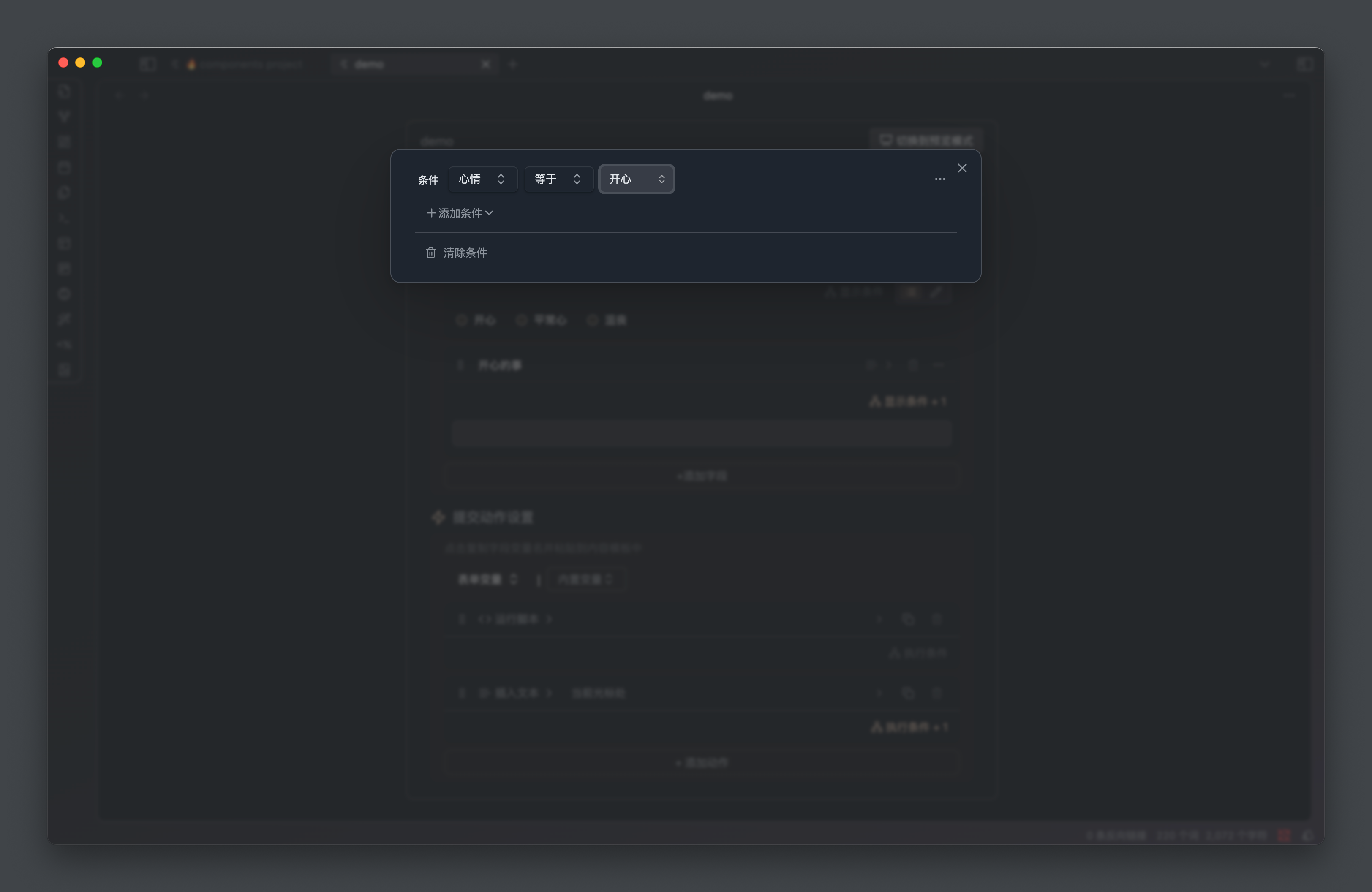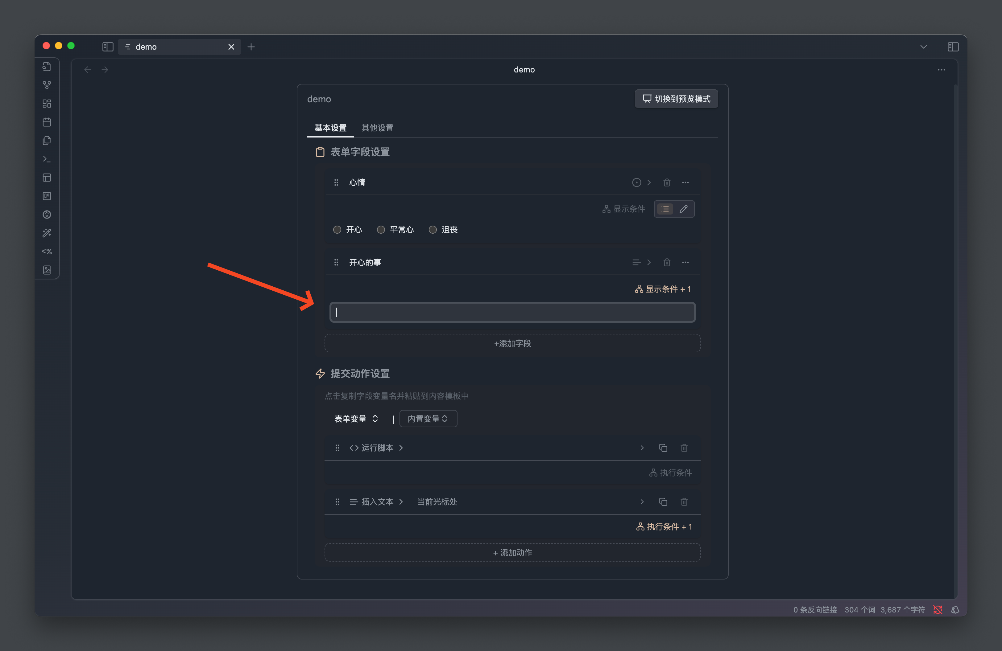 比如我们有一个心情录入表单,我们可以配置当 心情 等于 开心 的时候,展示 记录 文本字段用于记录当前发生了什么事情让我们感到开心。