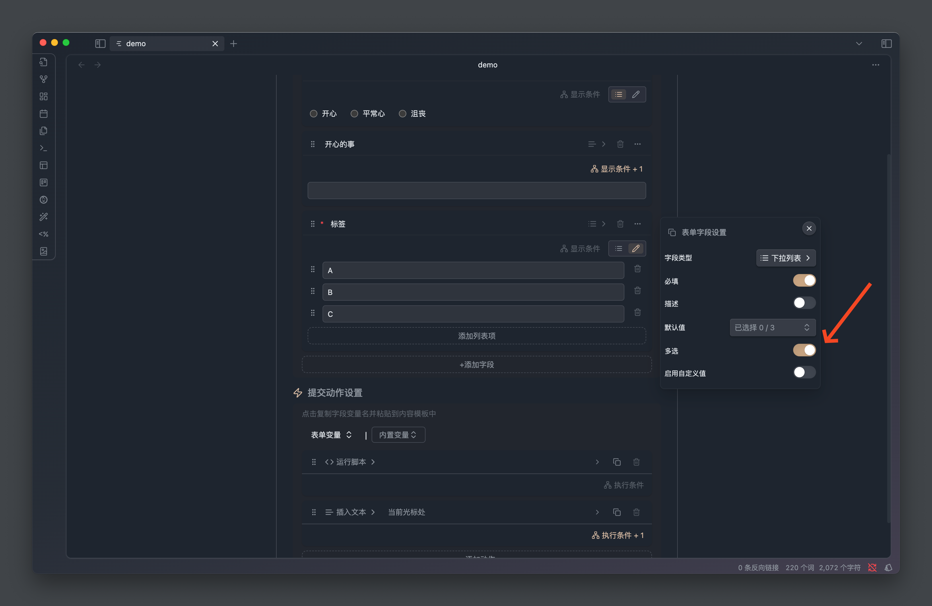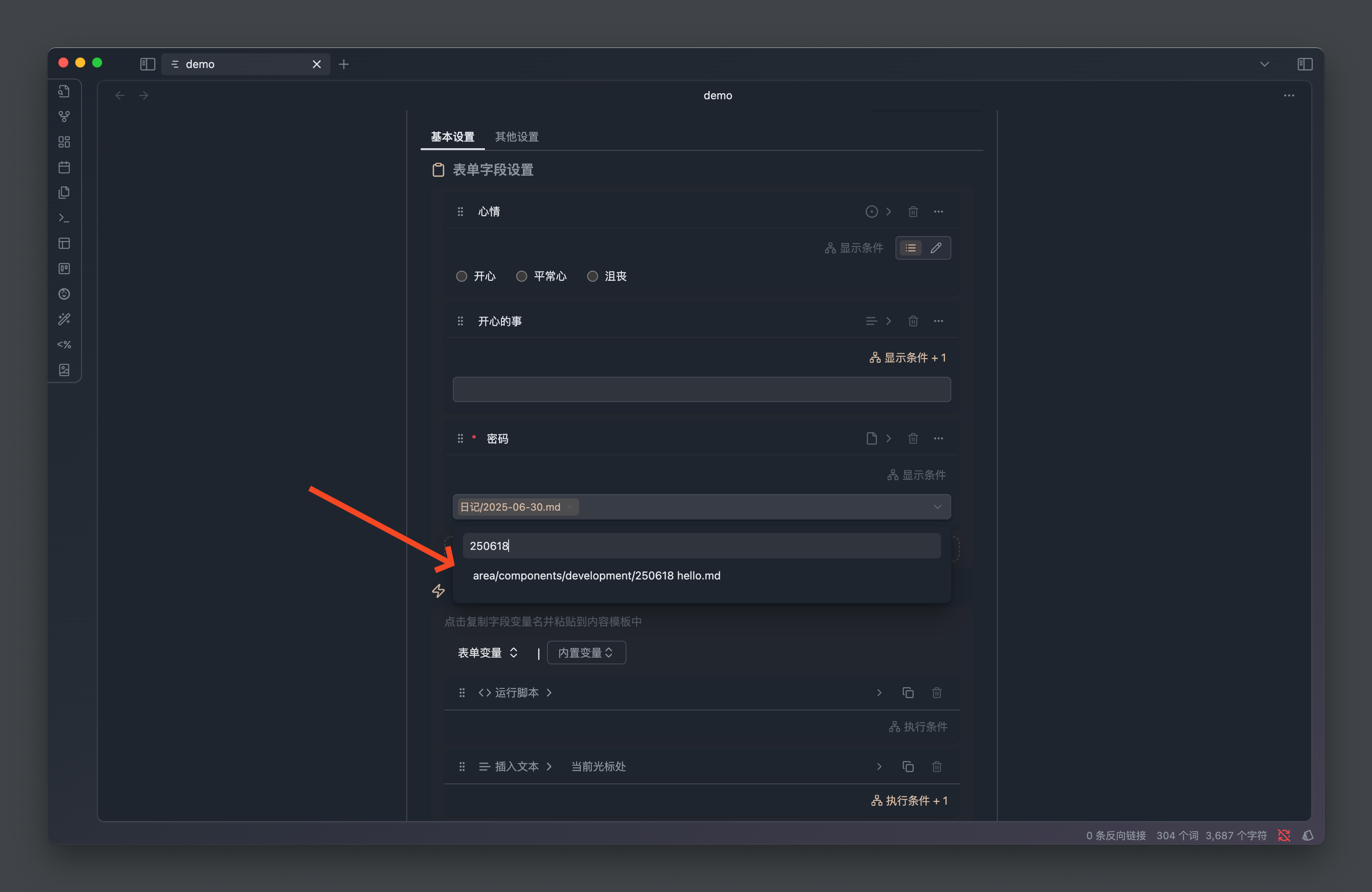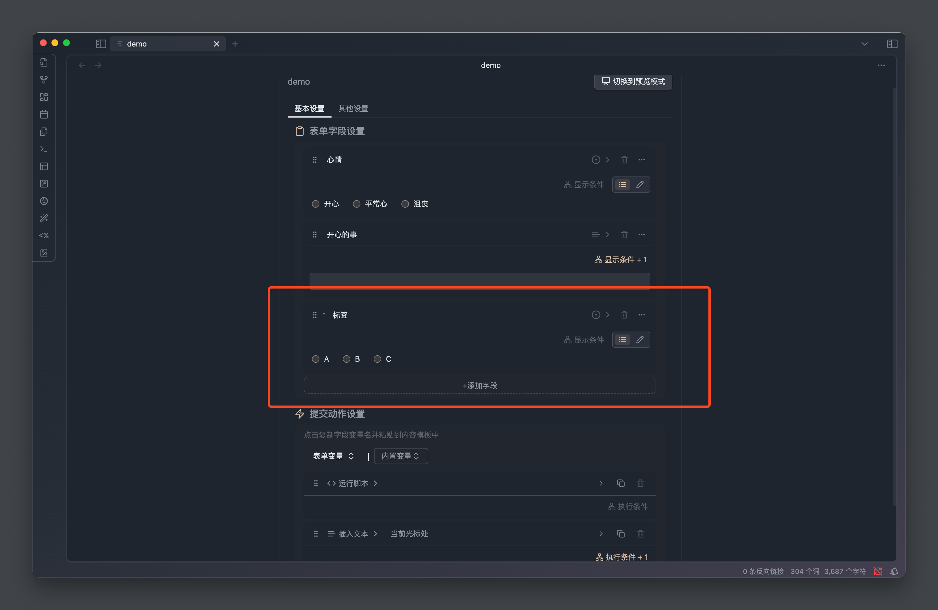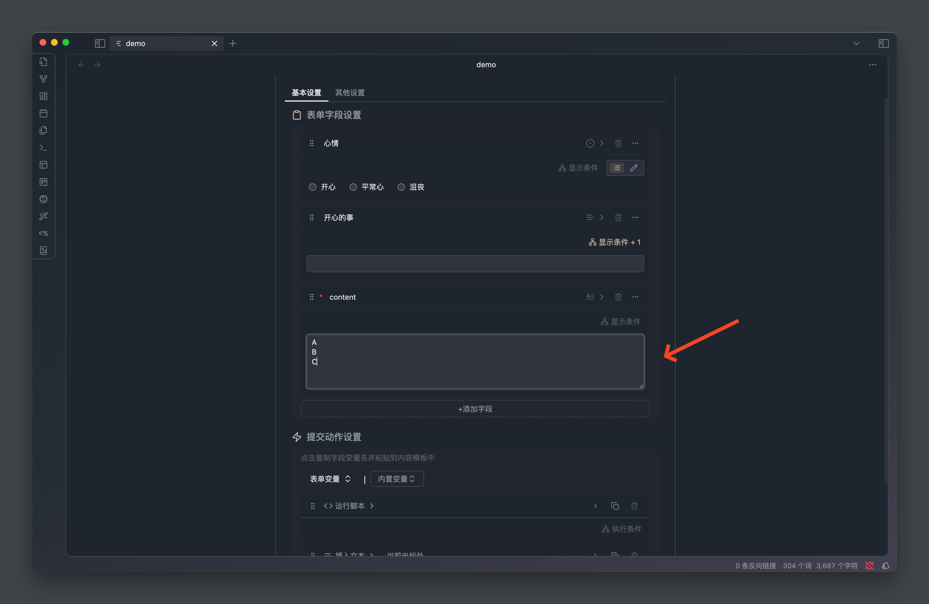 比如我们有一个心情录入表单,我们可以配置当 心情 等于 开心 的时候,展示 记录 文本字段用于记录当前发生了什么事情让我们感到开心。