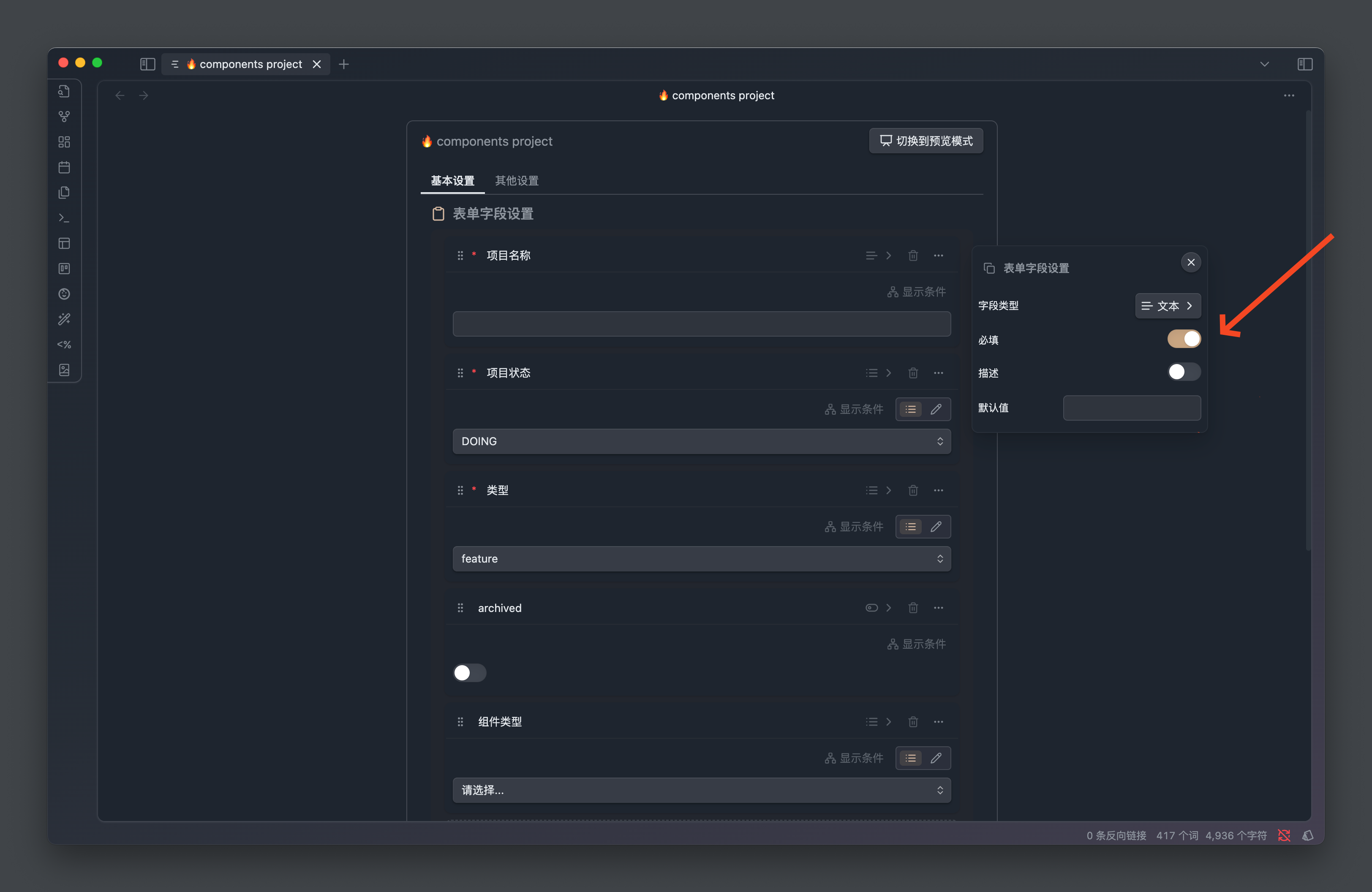 字段是由字段名、类型以及其它属性组成,不同的字段类型会以不同的组件形式展示,决定了内容的输入形式。