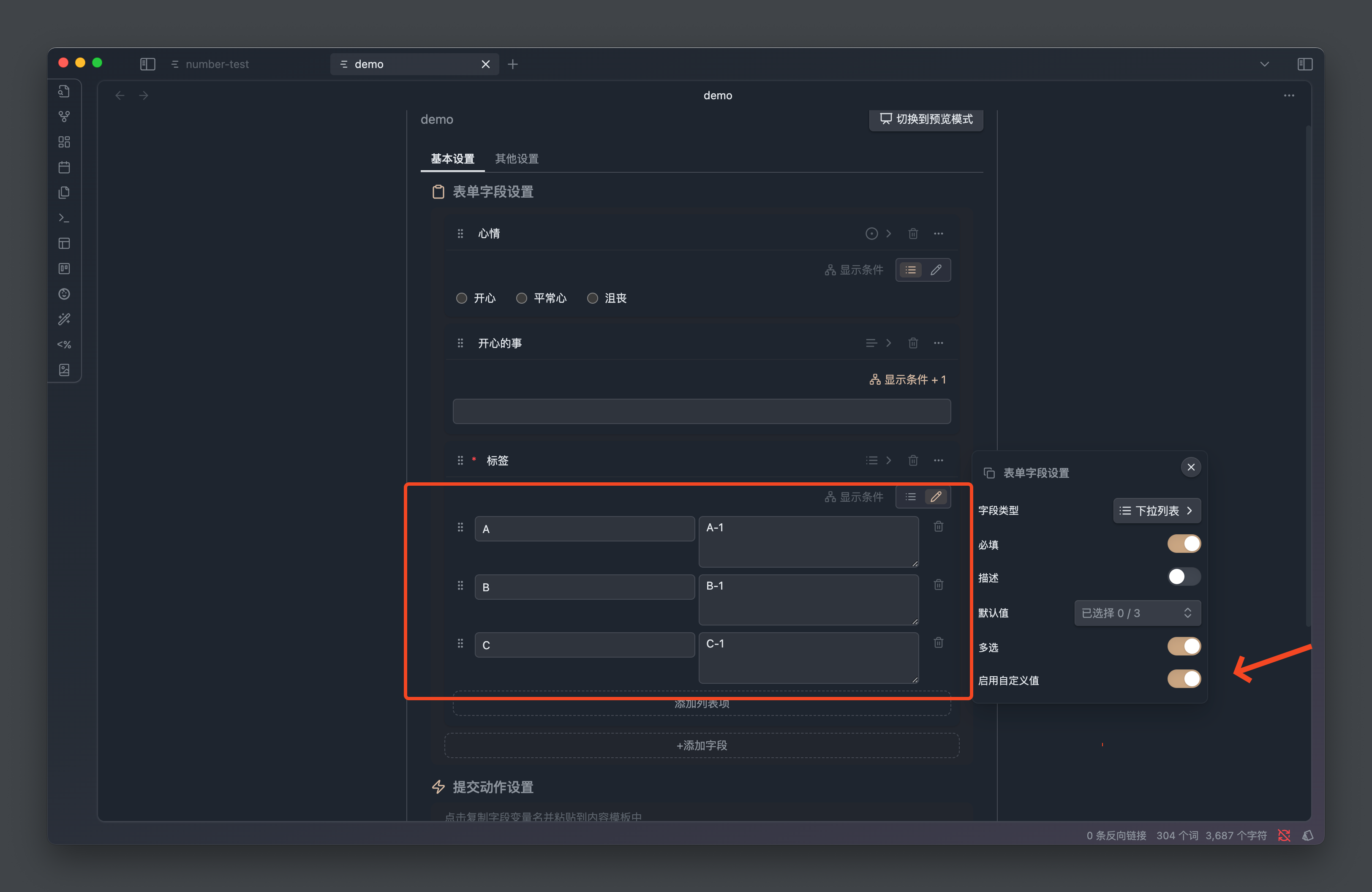 如果你希望列表展示的名称和实际输出的值区分开的话,可以打开「启用自定义值」的开关,这样列表的编辑区单行就变成了两个输入框:第一列是选项名称,第二列是选项值。