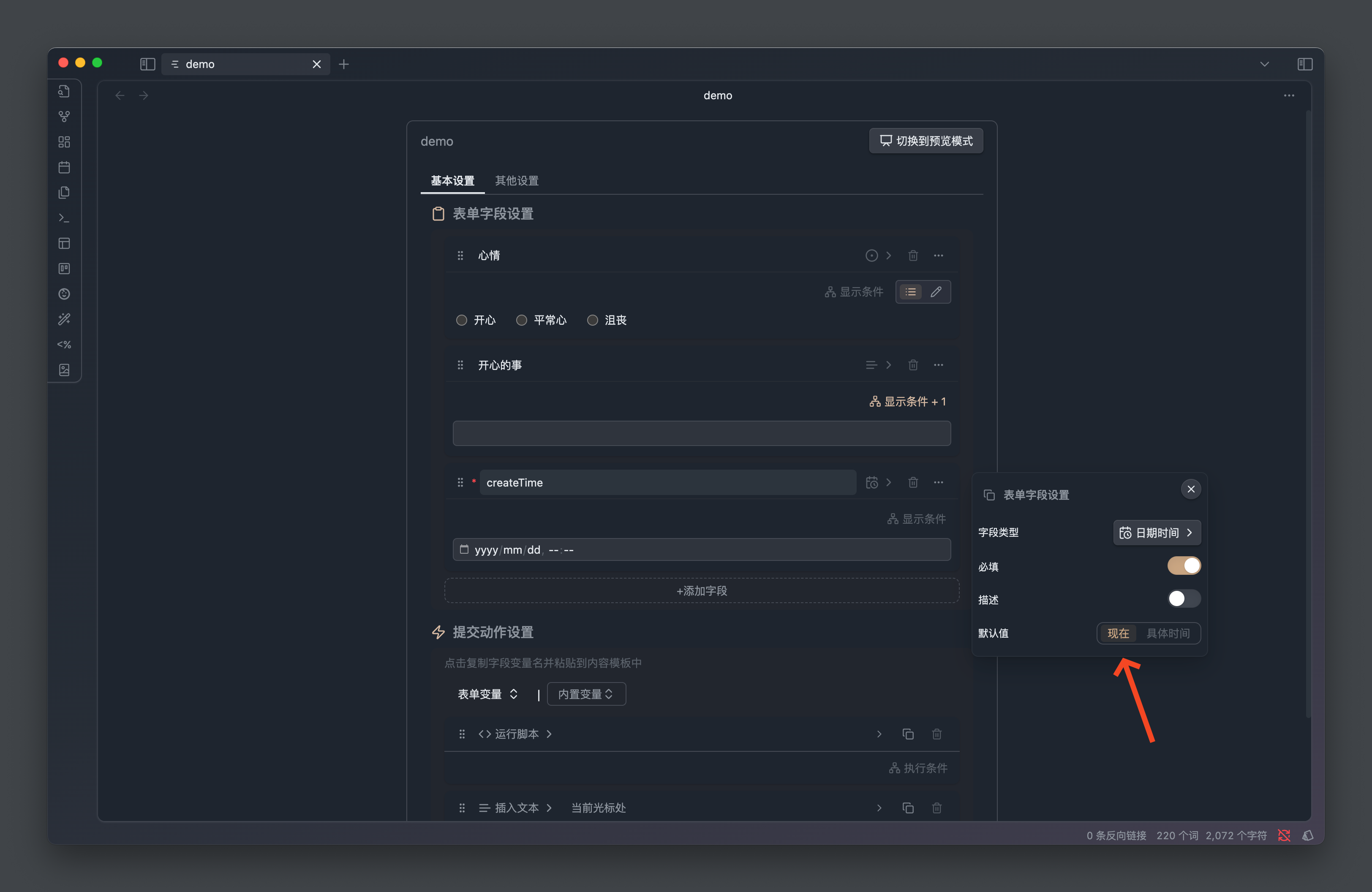 默认值除了具体的某个时间点外,还支持设置「现在」,在提交的时候会自动取当前时间作为值提交。