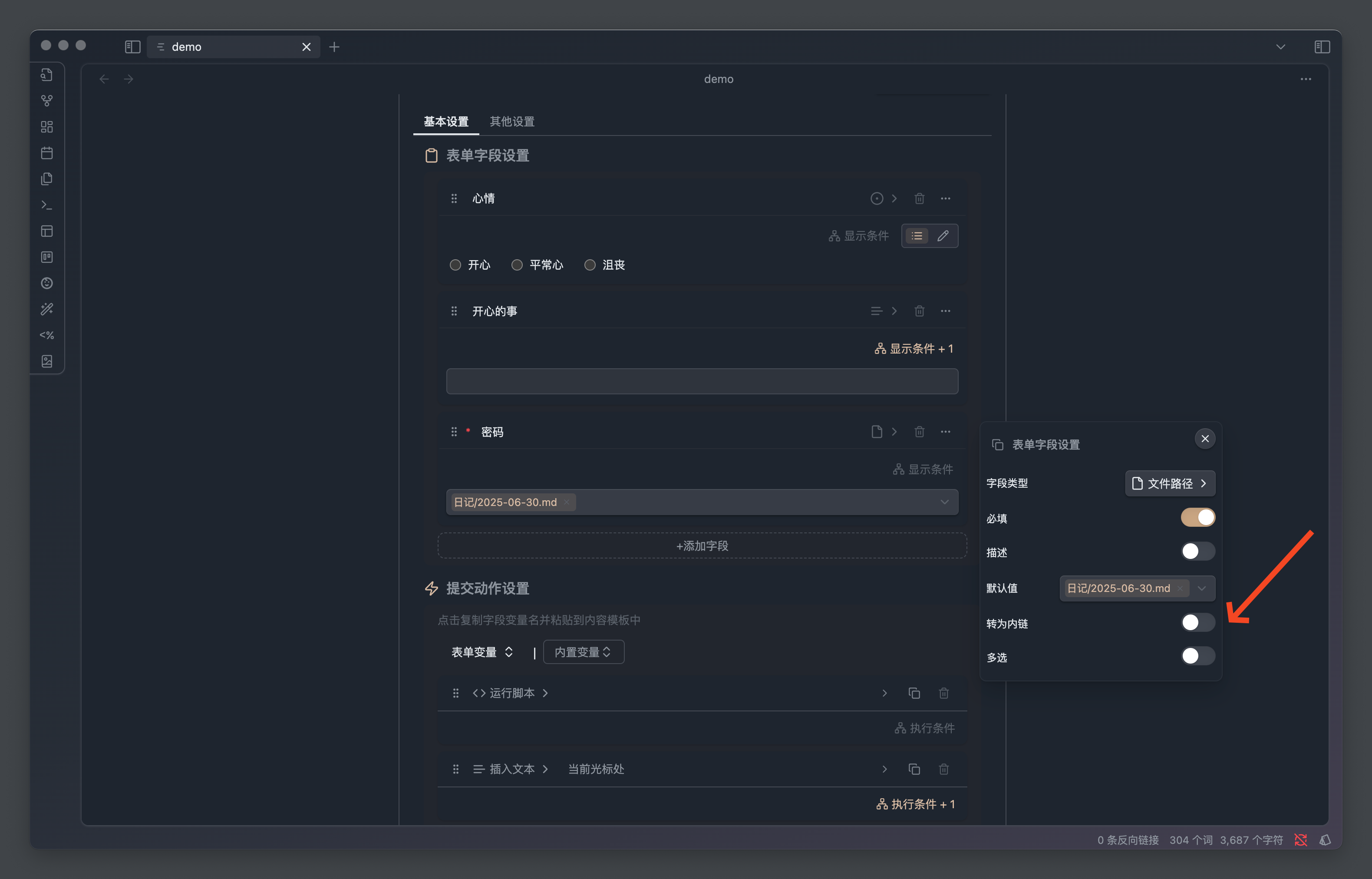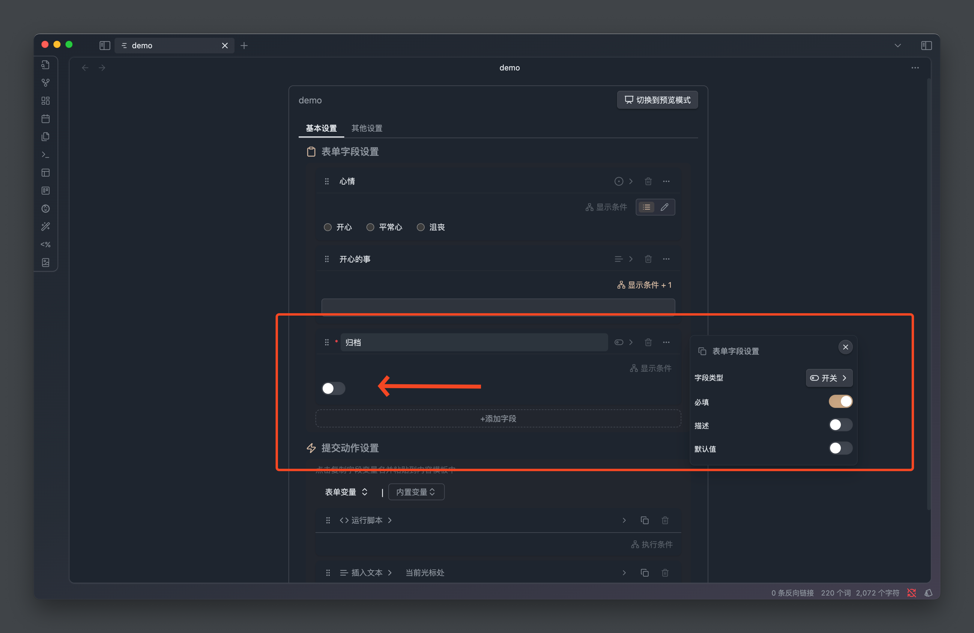 我们应该确保一个表单中的字段名不要出现重复,因为后续在执行动作中引用字段时需要使用 {{@字段名}}