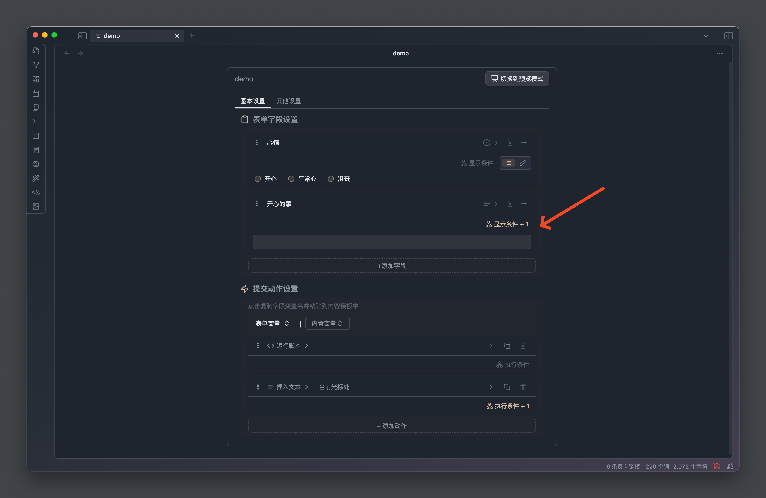 显示条件可以帮助我们构建更加灵活且强大的表单,如果配置了显示条件的话,该字段只有在满足条件的情况下才会显示在表单界面。