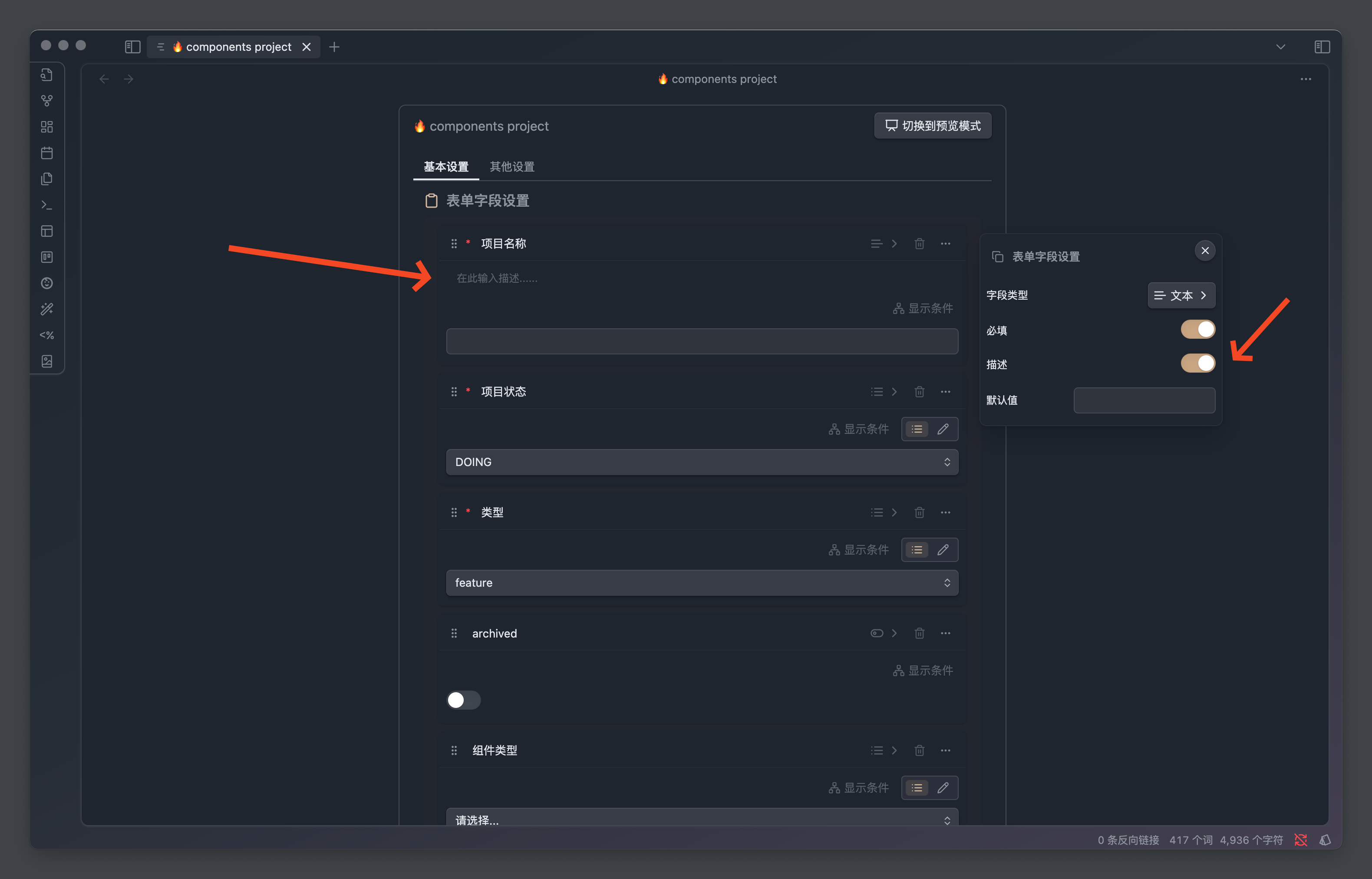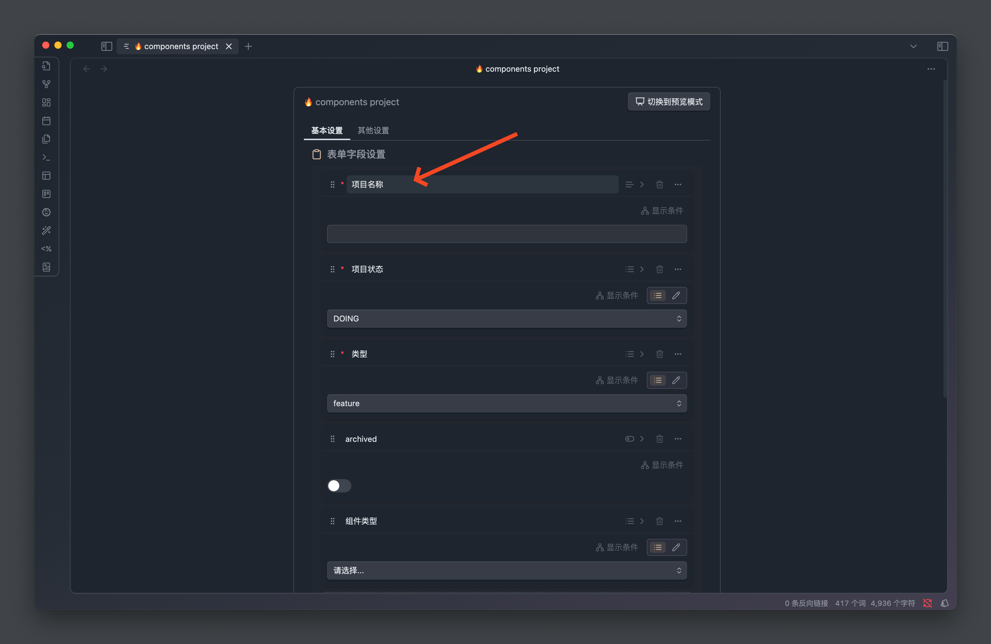 字段是由字段名、类型以及其它属性组成,不同的字段类型会以不同的组件形式展示,决定了内容的输入形式。